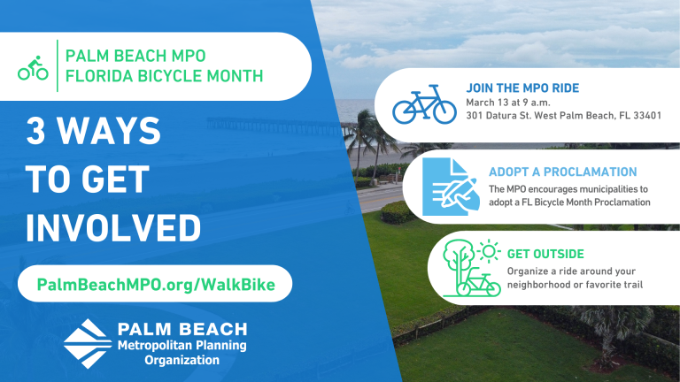 Florida Bicycle Month March is Florida Bicycle Month! Join the MPO for a bicycle ride on March 13. Learn more about celebrating Florida Bicycle Month with a proclamation or hosting a bicycling