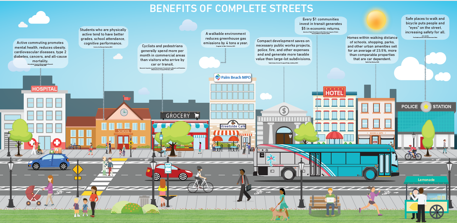 The Palm Beach MPO is committed to creating a safe, efficient, and connected multimodal transportation system. Advancing Complete Streets supports this vision by promoting context-sensitive roadway designs that safely and comfortably accommodate all users, including pedestrians, bicyclists, transit riders, motorists, and people of all ages and abilities.