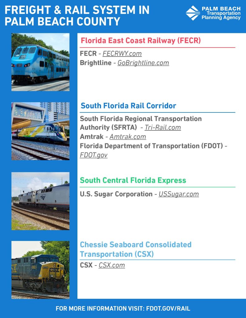 There are two main rail corridors running through Palm Beach County, the Florida East Coast (FEC) railway corridor and the CSX railway corridor, a portion of which is owned by the Florida Dept. of Transportation for use by Tri-Rail commuter trains. Additionally, U.S. Sugar owns and operates the South Central Florida Express (SCFE) railway in western Palm Beach County.