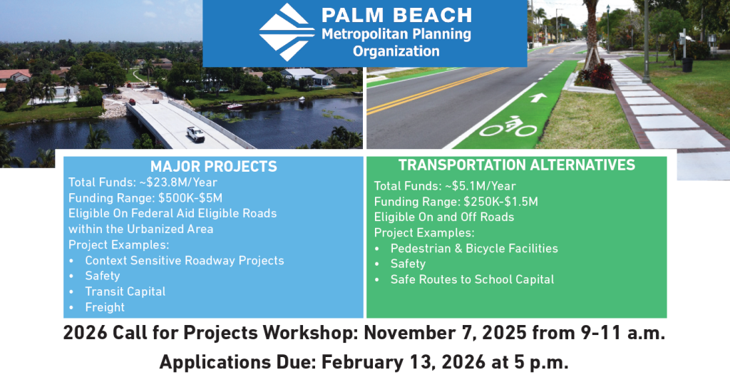 The Palm Beach MPO is hosting its 2026 Funding Program Workshop to share information about available project funding resources, coordinating updates to the Long-Range Transportation Plan, and providing program eligibility and submittal requirements.