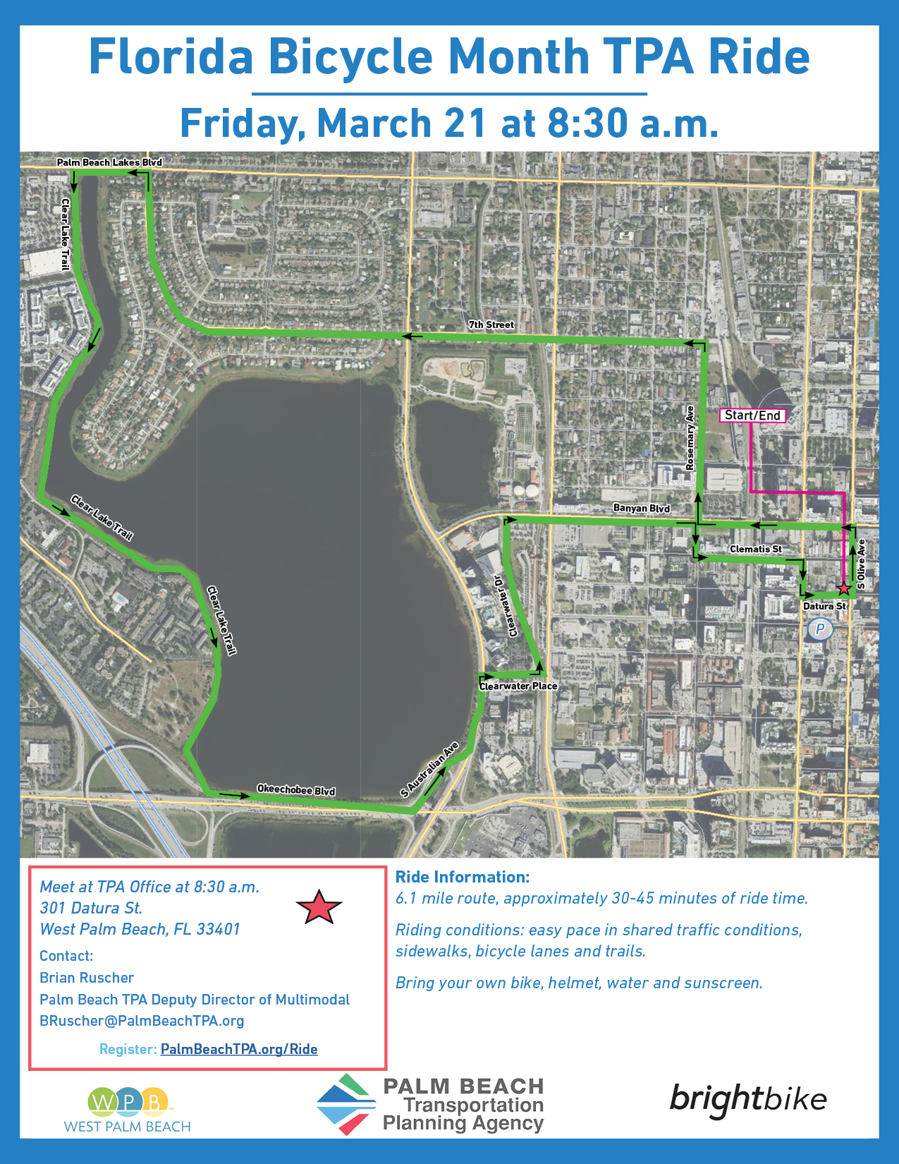 The MPO hosts an annual Florida Bicycle Month Bike Ride every March! This year, it will be held on March 21 at the MPO. To register for the ride, click here.