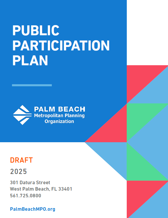 The Public Participation Plan outlines the MPO’s strategies for promoting public involvement in the transportation planning process across Palm Beach County and the Miami Urbanized Area. It ensures an open, transparent process that provides complete information, timely public notice, access to key decisions, and opportunities for early and ongoing public participation. The PPP was adopted by the MPO Governing Board on March 16, 2023.